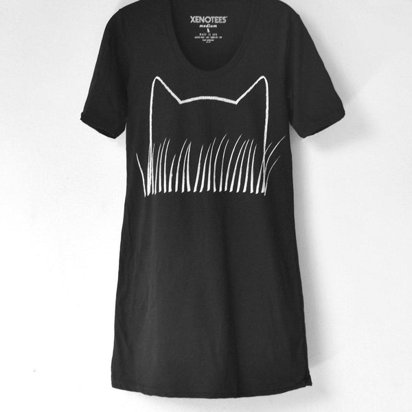 The womens' cat grass dress is a brand new addition to the Xenotees cat lovers' line of clothing. It's a super soft t-shirt dress by American Apparel, screenprinted by hand with eco friendly white ink.