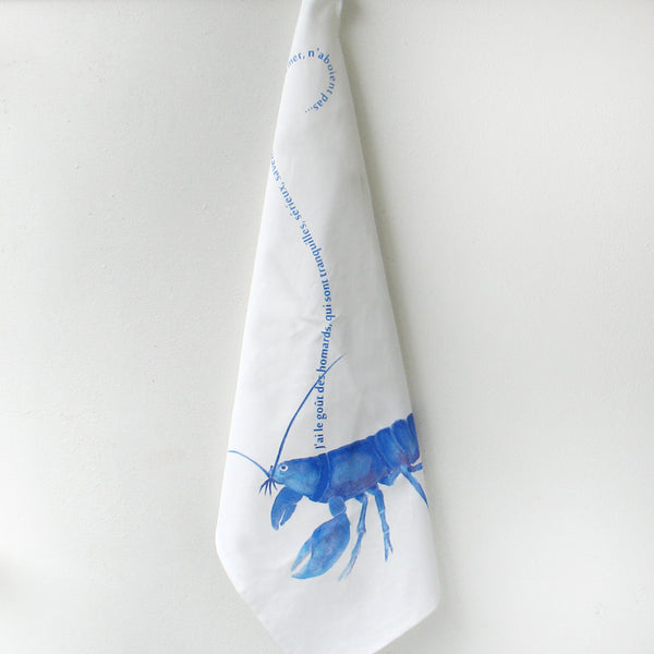 French Poet Gérard de Nerval inspired Pet Lobster Kitchen Tea Towel - Infused with the same creative energy as French poet Gérard de Nerval, this Pet Lobster Kitchen Tea Towel features an original watercolor by artist Noelle Burke, screen-printed onto a 100% cotton flour sack towel. Each towel is uniquely hand-screened, resulting in variations in print darkness and color. The lobster's leash bears the French phrase for "I have a liking for lobsters. They are peaceful, serious creatures. They know the secrets of the sea, they don’t bark..." and captures the peaceful and serious nature of these sea creatures. Like the poet himself, who famously walked his pet lobster on a ribbon, this towel is a unique and inspired choice for your kitchen.