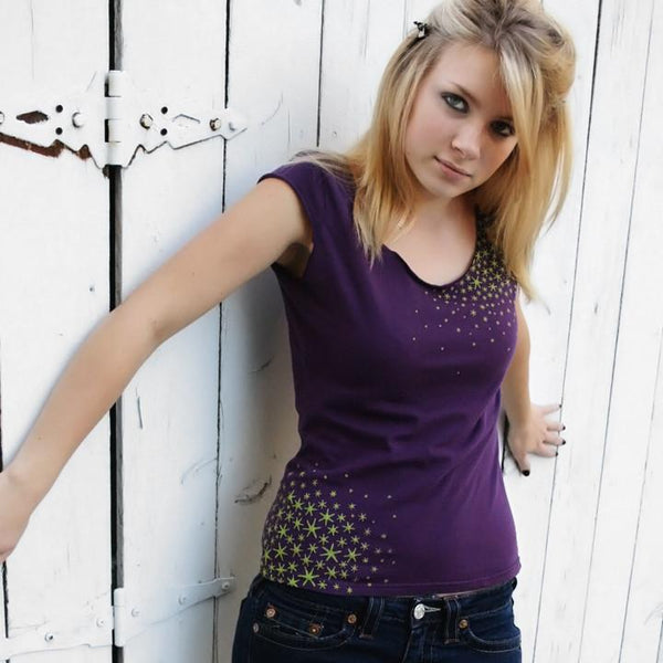 Printed with Plush green ink for a soft mossy effect, on a scoop neck, sleeveless American Apparel shirt.